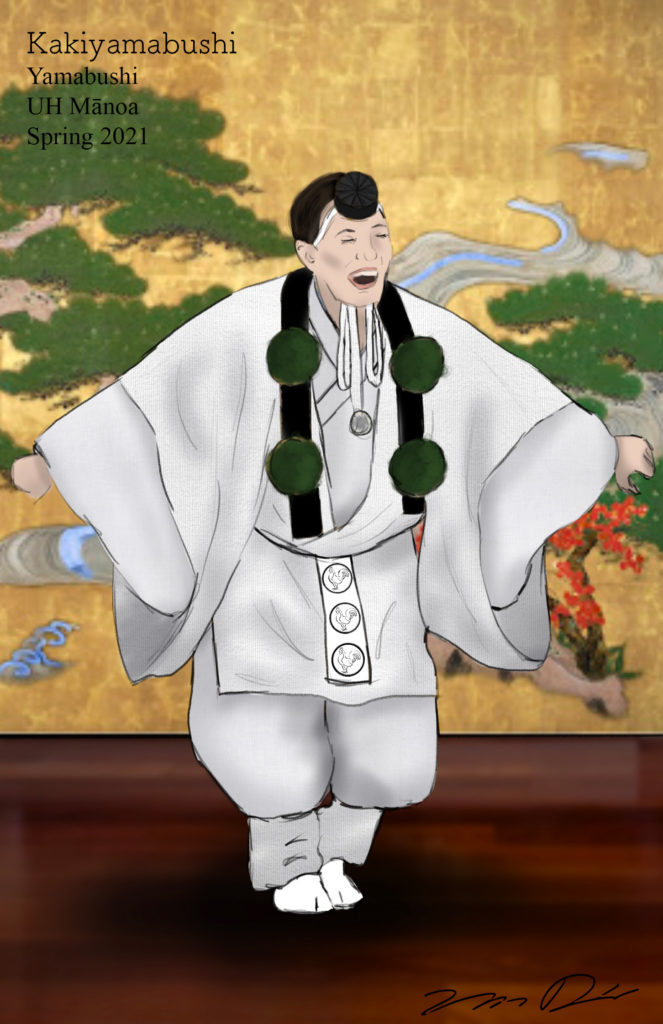 Mango Yamabushi, being the first student piece, is the most traditional of the program (after the classical kyōgen play, Sword Stealing (Tachiubai) presented by our teachers). However, while the Yamabushi’s dressing style is that of a traditional kyōgen yamabushi, he wears the white colors of a modern-day Japanese yamabushi, thus combining both the modern with the traditional. The Farmer, on the other hand, is from Kauaʻi. In the original kyōgen piece, Kaki Yamabushi (Persimmon Yamabushi), this character is a landowner of higher status and would traditionally wear a matching top and bottom nagabakama (“long hakama (pants)”) set to indicate his social rank. Since a farmer does not have the same rank as a landowner in the world of kyōgen, we changed the nagabakama set to the kataginu (vest) and hanbakama (“short hakama”) of a lower status character. The hakama themselves then transformed into pleated pants to make dressing easier. The kimono was made out of a traditional Hawaiian fabric, palaka. The mon (crests) both characters wear represent both the action of the play and the place – the chicken on the Yamabushi and plumerias on the Farmerʻs pants are both reflective of where and when we are.
